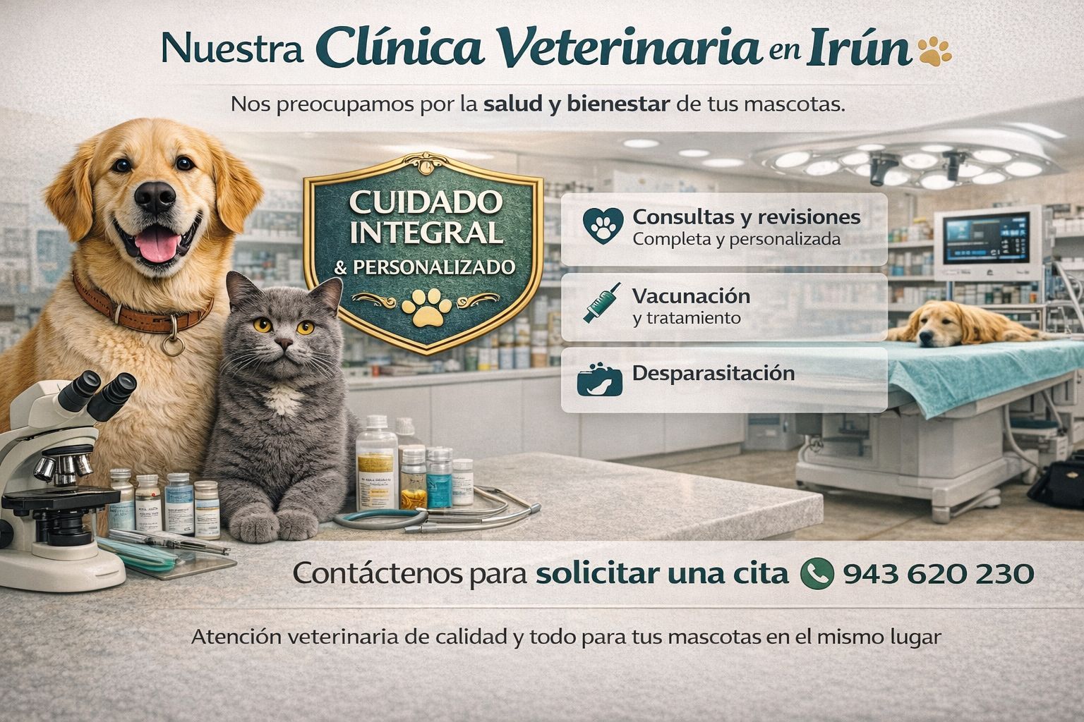 Somos un centro veterinario en Irún con más de 30 años de experiencia, donde encontrarás atención veterinaria, tienda especializada para mascotas, peluquería canina y felina y hotel y guardería para mascotas, todo en un mismo espacio. Atendemos perros, gatos y otras mascotas como aves, peces y pequeños roedores, ofreciendo un trato cercano, profesional y personalizado.